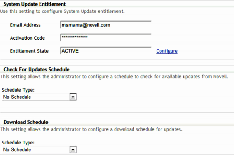 Before you receive system updates, you need to configure the System Update settings on the Configuration page in ZENworks Control Center. For customers with maintenance contracts, Micro Focus provides an activation code that allows you to start receiving periodic updates. After you have activated your zone, you are ready to start receiving content from Micro Focus. All you need to do is, simply enter your e-mail address and the activation code, as seen in the following diagram.
