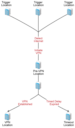 The location switches from the Pre-VPN location to the Timeout location if the delay expires before a VPN connection is detected.