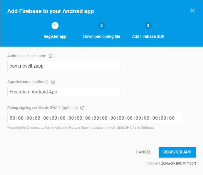 Specify the Android Package Name for the ZENworks Agent App, that is, com.novell.zapp. Click Register App.