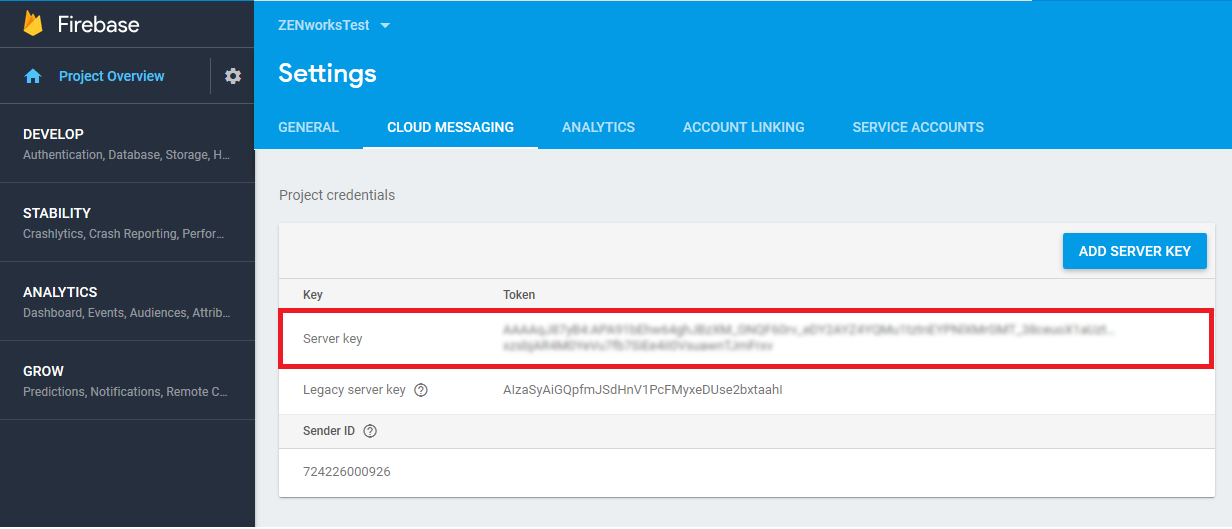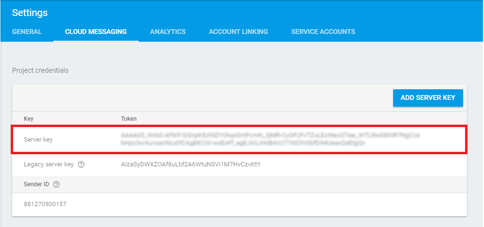 Select the Cloud Messaging tab. You can now view the Server Key. Note down this Server Key.