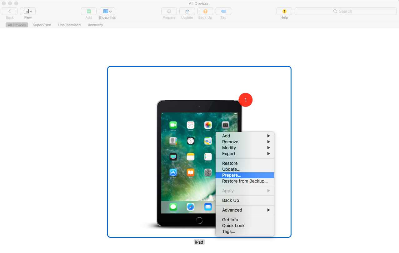 Right-click and select Prepare or select Prepare from the top menu bar in the Apple Configurator.