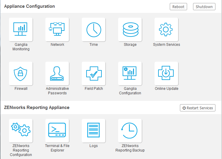 Figure 6-1 Appliance Home page (after configuring ZENworks Reporting)