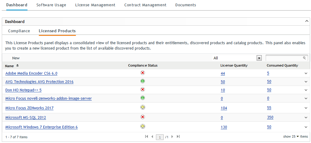 The License Products tab lists the licensed products along with its compliance status and license quantity. Click any of the licensed products to view additional license-related information.