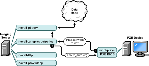 After the Preboot Services bootstrap program is downloaded and executed, the device checks novell-zmgprebootpolicy to see if there is any imaging work to do.