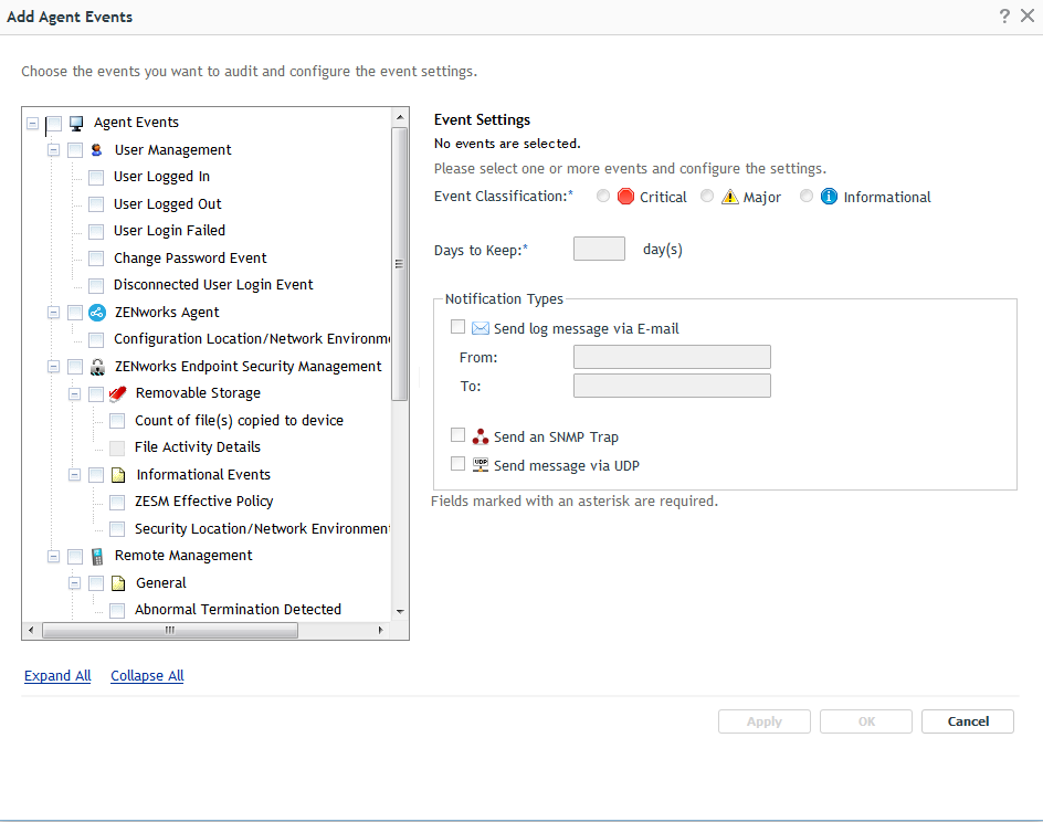 Select the attributes such as Event Classification Type, Days to Keep, and Notification Types etc for each event either separately or combined.