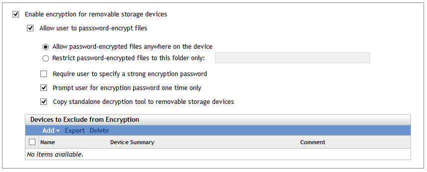 You can configure the Data Encryption policy to automatically install the File Decryption utility on encrypted removable storage devices. With this policy setting in place, the Endpoint Security Agent installs the utility in an Novell Decrypt Tool folder when the removable storage device is first encrypted.