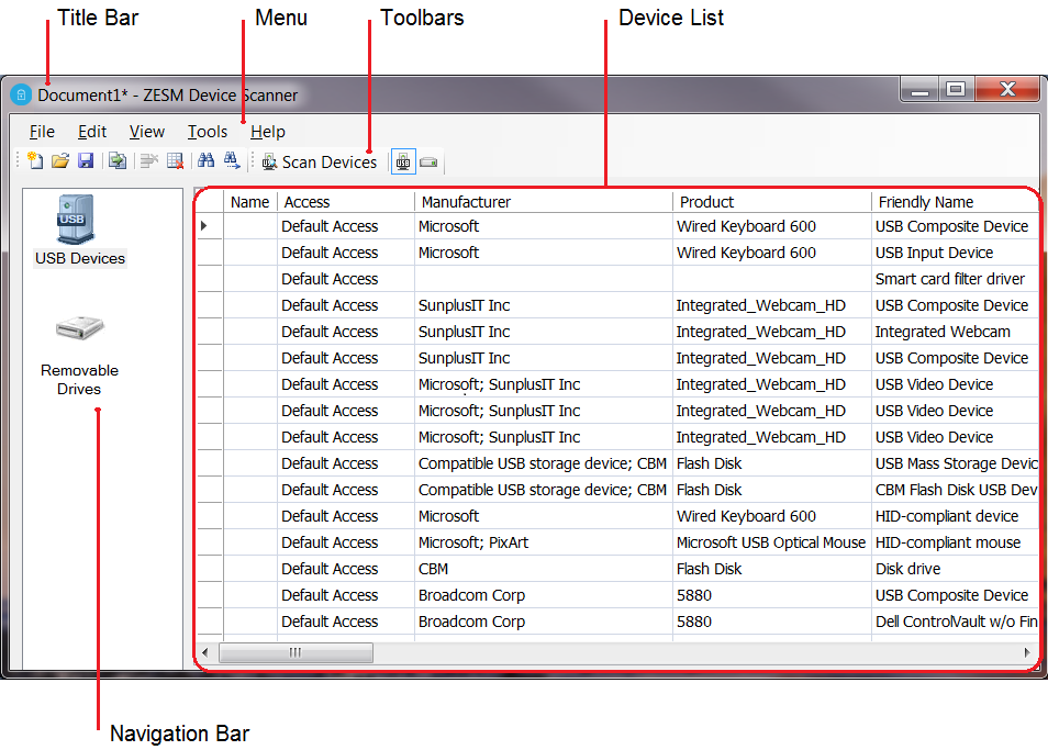 The Device List is your workspace. Use the options available on the toolbars and menu to scan devices, view the scan data, and modify the data as needed to prepare it for use in security policies.