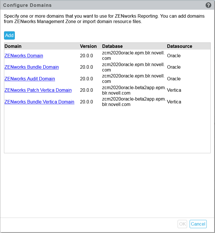 Specify one or more domains that you want to use for ZENworks Reporting. You can add domains from ZENworks Management Zone or import domain resource files.