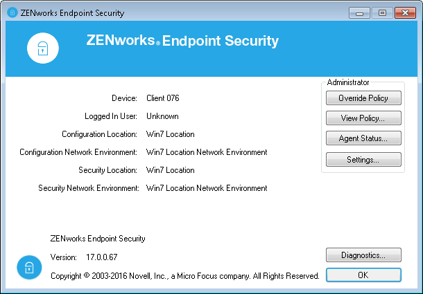 The Endpoint Security Agent provides several features that are intended for use only by a ZENworks administrator or by a user under the direction of a ZENworks administrator. These features are grouped together in the Endpoint Security Agent’s About dialog box.