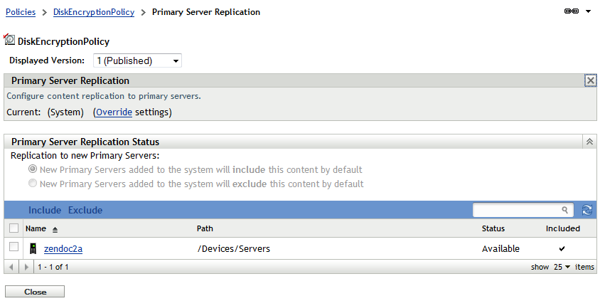 In the list of existing Primary Servers, select the servers that you want to receive the policy, then click Include.