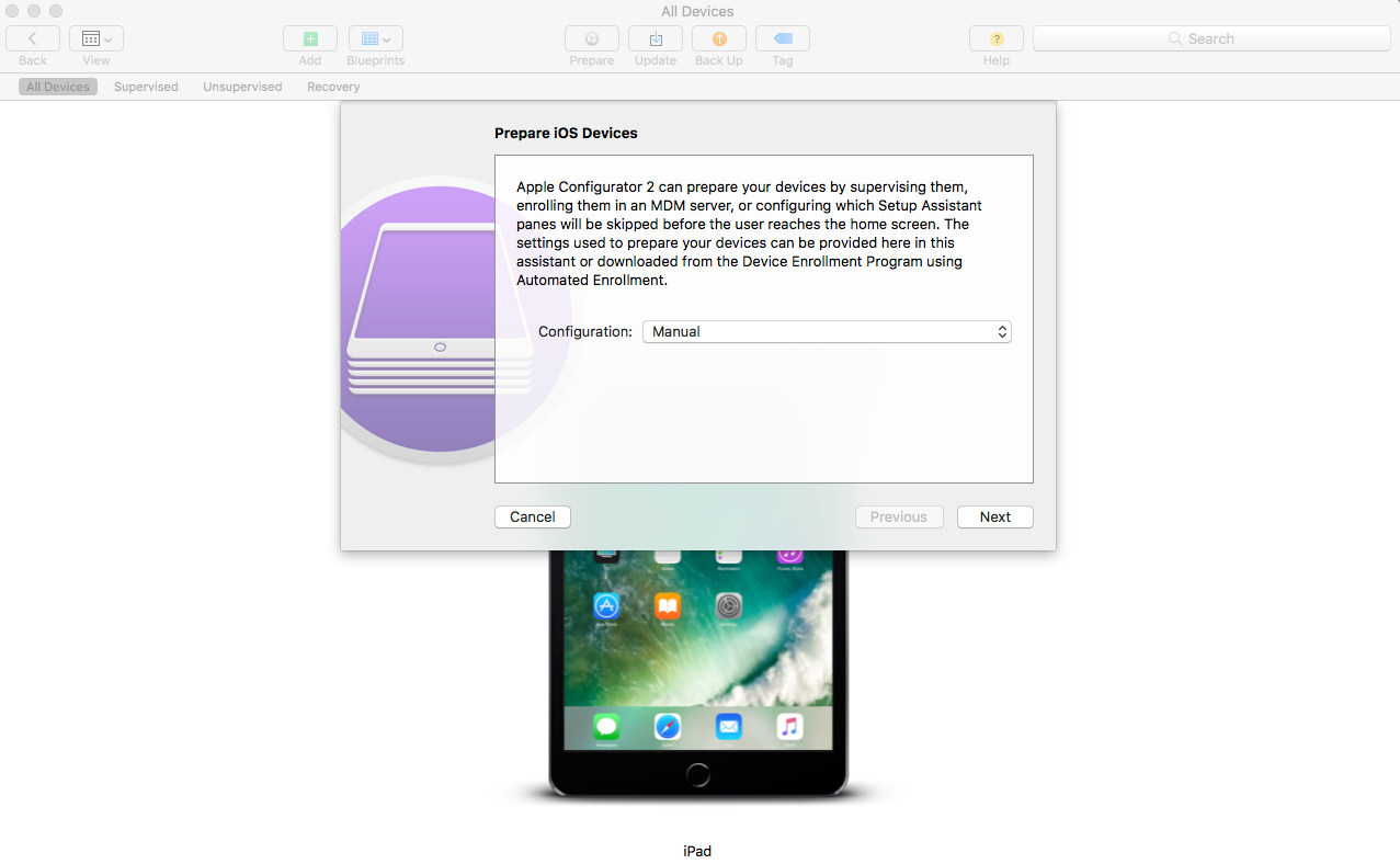Apple Configurator is a Mac OS X tool that assists administrators in the deployment of iOS devices in business or education settings. Apple Configurator makes reassigning devices quick and simple, allowing the next user to start with a clean slate of content.