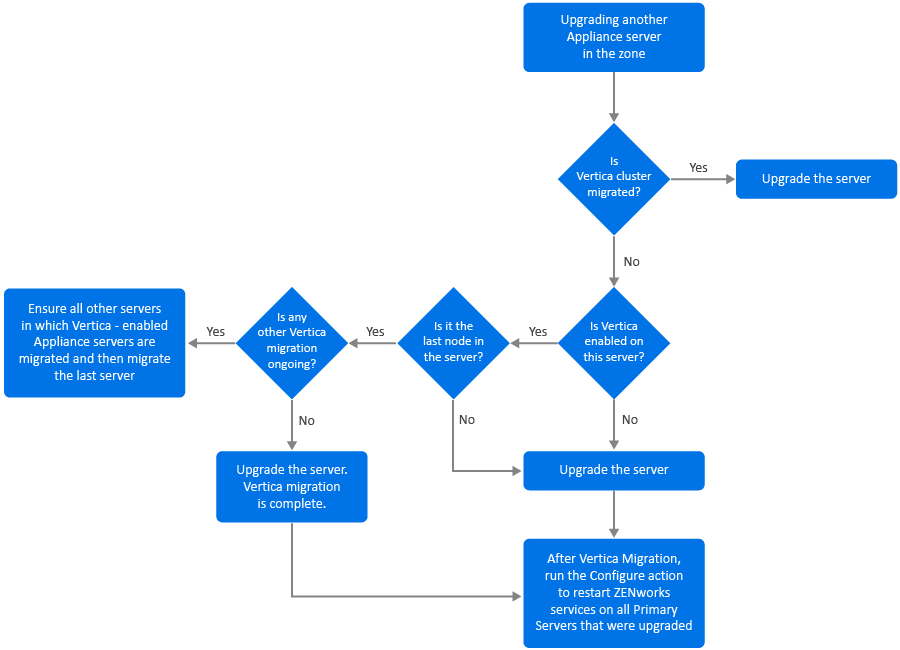 After the last node in the Vertica cluster is upgraded, run the Configure action microfocus-zenworks-configure-c Start to restart the ZENworks services on all the Primary Servers that have been upgraded until now