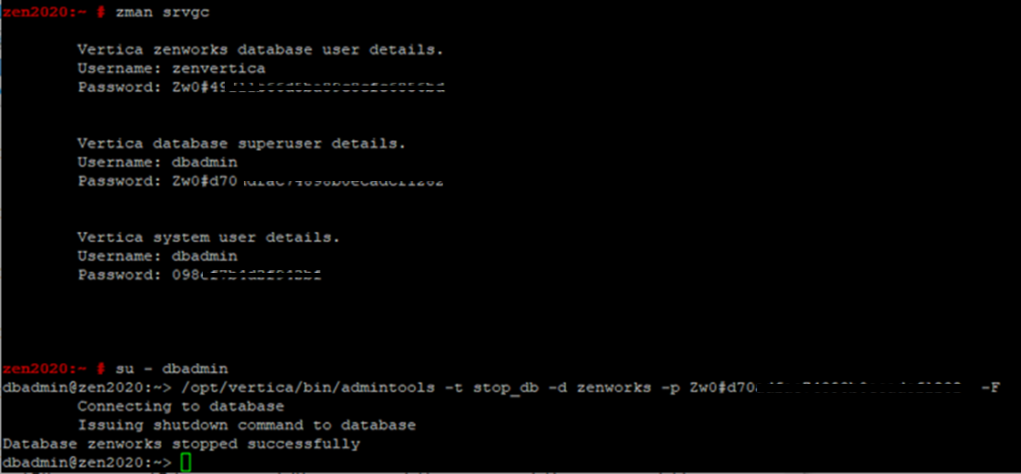 NOTE:ZENworks has two sets of commands to stop/start Vertica. They are new commands and old commands.