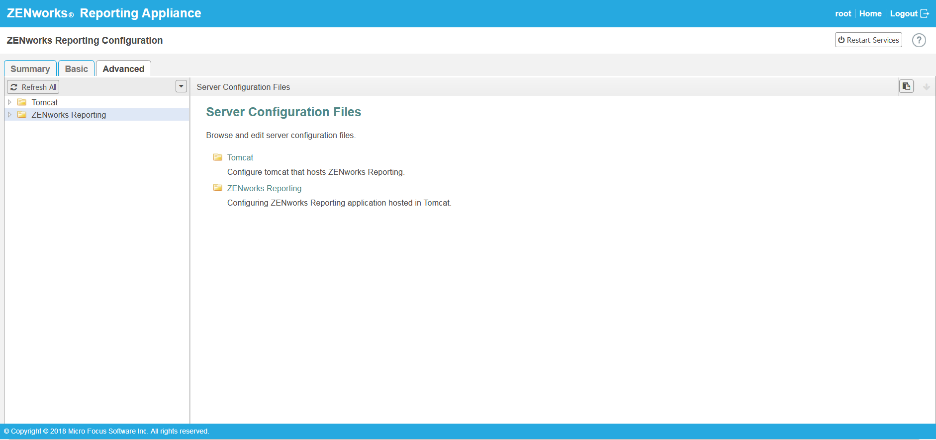 The Advanced view enables you to view, configure, or edit any server configuration file that is related to ZENworks Reporting, such as Tomcat and ZENworks Reporting.