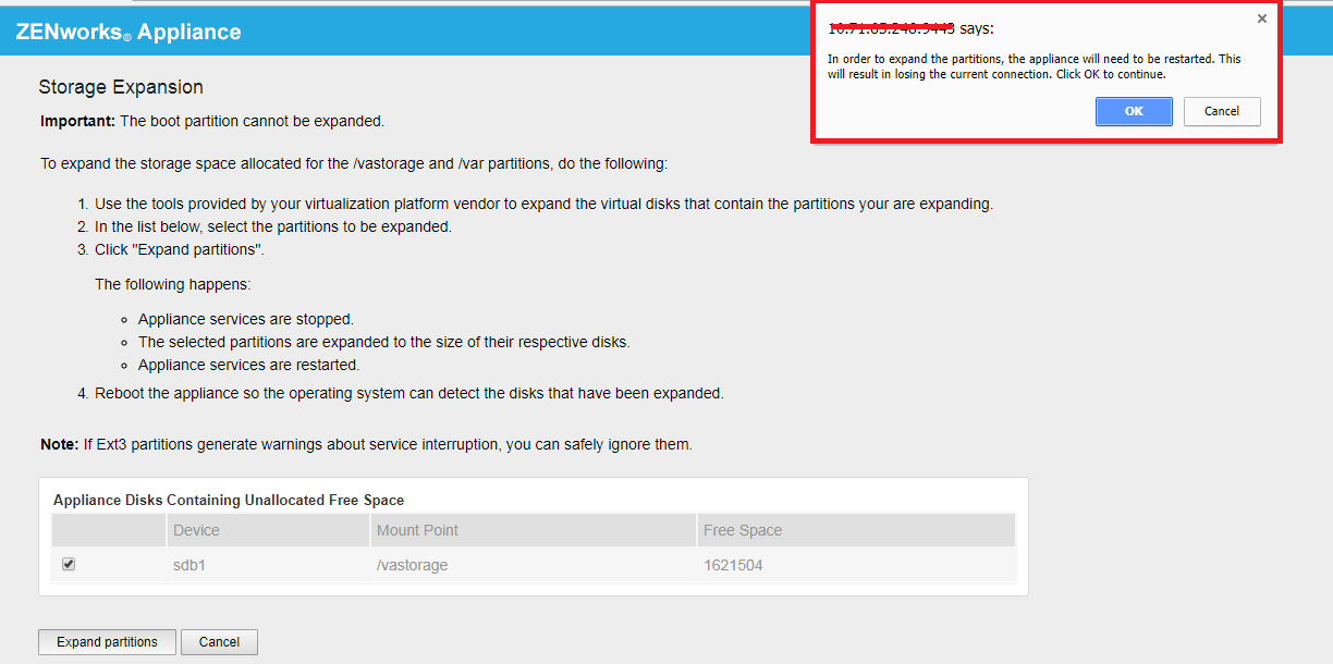 After clicking Expand partitions, a browser pop-up message is displayed.