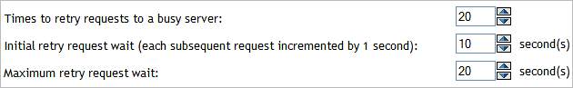 • Initial retry request wait: The initial wait time between each of the above retries. All subsequent waits increment by 1 second. This means that the first wait time is 10 seconds, the second wait time is 11 seconds, then 12 seconds, 13 seconds and so on, up to the amount in the Number of Retries setting.