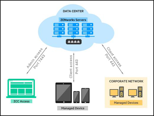 Since the client communication to the ZENworks server happens over specific ports, the server firewall can be configured to allow access to those ports from outside the data center. The only exception is to provide access to the administrative port (default 7443) for any designated devices. You could use any standard networking technique to separately set up servers in an isolated network or provide restrictive access in a data center.
