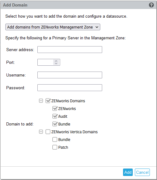 Choose Add domains from ZENworks Management Zone, then specify the following: