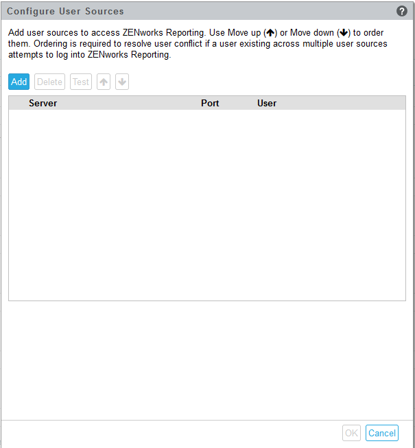 Delete: Select the user source that you want to remove and click Delete. If a user source is deleted, the users from that user sources cannot have access to ZENworks Reporting.