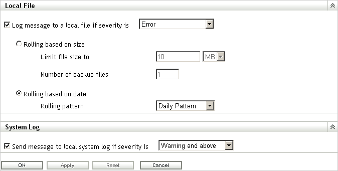 This settings page allows you to set the rollup schedule for a specific time or date. We recommend that you create a new log file every day to ensure accurate information for troubleshooting purposes.