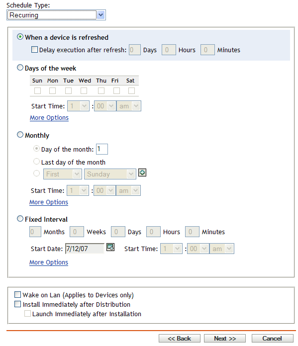When a Device Is Refreshed: This schedule causes the event to occur each time the ZENworks Agent performs a refresh on the device. If you want to delay the event so that it does not happen immediately upon refresh, select the Delay execution after refresh option and specify the number of days, hours, or minutes you want to delay the event.
