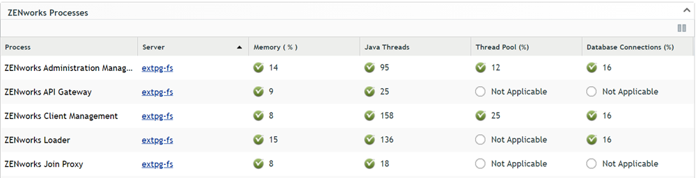 The ZENworks Processes page is displayed when you click any of the Primary Server names. This page provides information about the Java processes, as shown below: