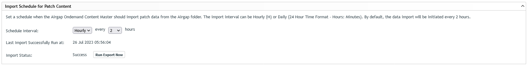 After pre-fetching the selected patches is complete, click Run Export Now in the Airgap Content Schedule, to get the data immediately.