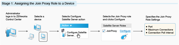 In ZENworks, Join Proxy is a role that is by default assigned to Primary Servers; you can also assign this role to Satellites.