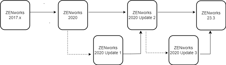 The following chart represents the upgrade path from ZENworks 2017 version to the most current ZENworks 23.3 version.