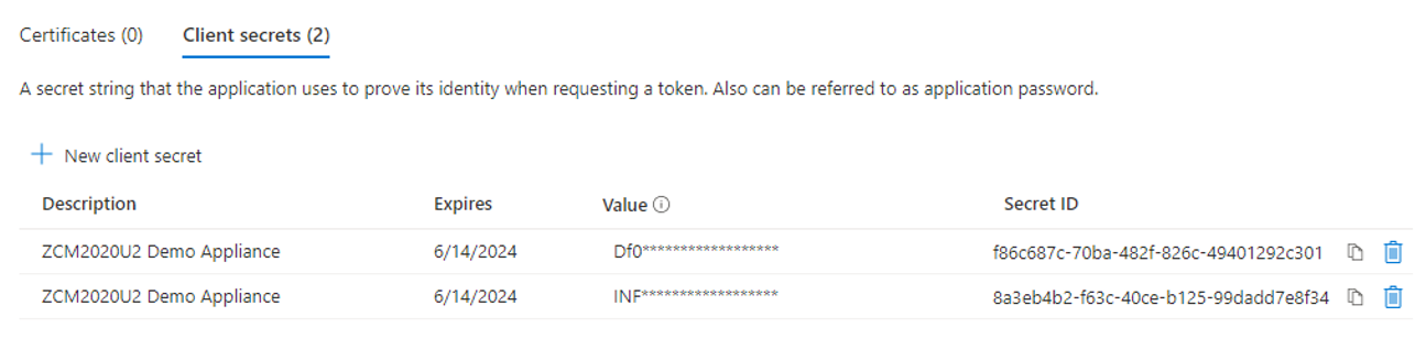 A new secret will be created. Copy the Value data, which is the Application secret.
