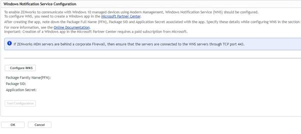 To enable ZENworks to send push notifications to Windows devices that are managed through Windows Modern Management, Windows Notification Service (WNS) should be configured.