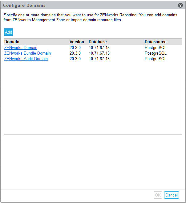 11. Specify one or more domains that you want to use for ZENworks Reporting. You can add domains from ZENworks Management Zone or import domain resource files.