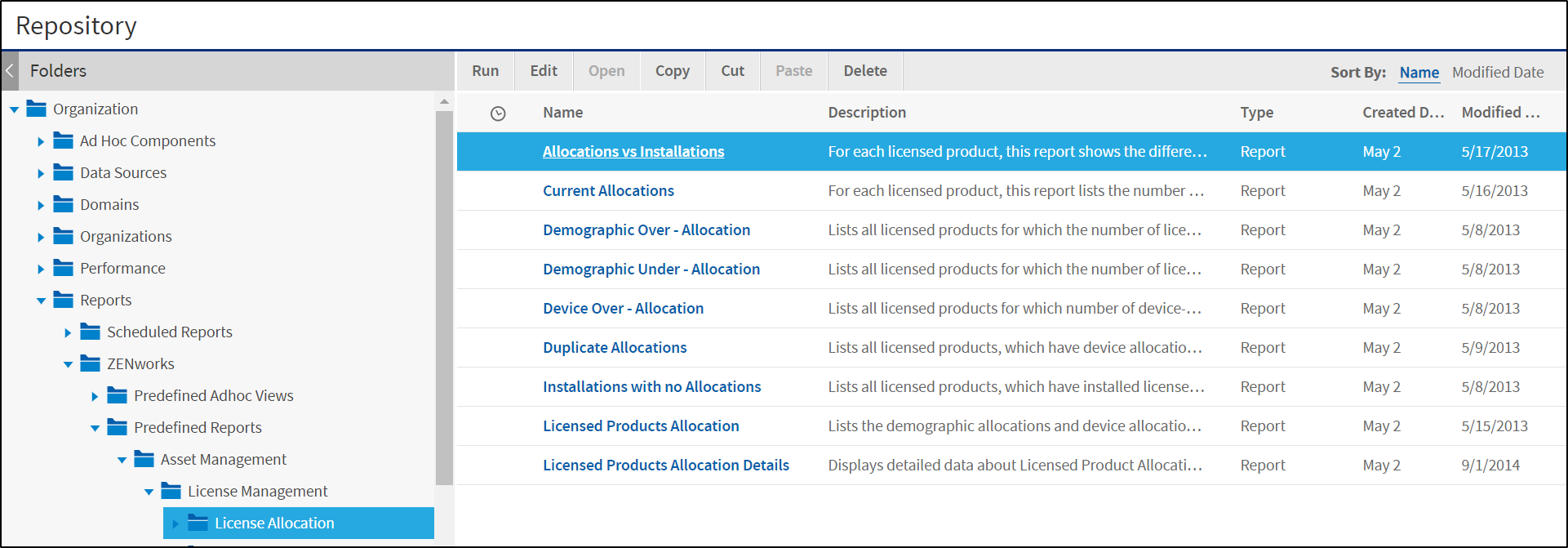 The Repository is the internal storage for reports, analysis views, and related files of the server. The Repository is organized into folders that contain resources such as file systems. However, unlike a file system, the repository is stored as a private database that only ZENworks Reporting can access directly.