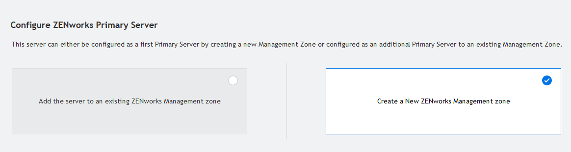 In the Configure ZENworks Primary Server screen, select Create a New ZENworks Management Zone, and then click Next.
