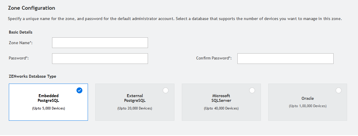 Depending on the number of devices you plan to manage in this ZENworks Management Zone, you can select any of the following databases: