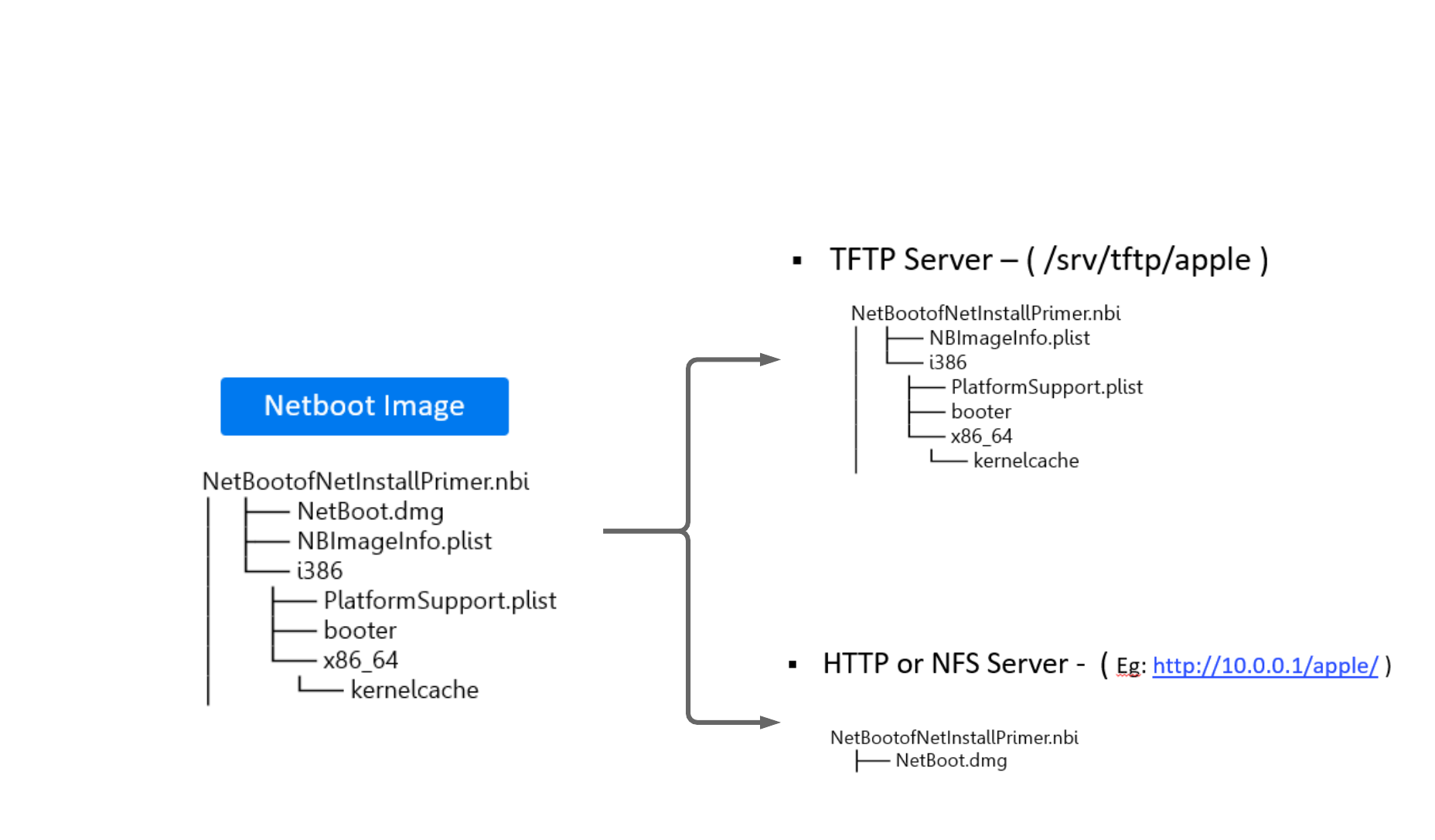 NOTE:Ensure that the NBI folder (Eg:NetInstallSierra.nbi) name where the files are copied in the TFTP and HTTP/NFS servers should have same name. The path to the ‘.dmg’ file will be derived based on the name of the nbi folder in ‘<tftp>/apple’ folder. Giving a different name will cause the download to fail.