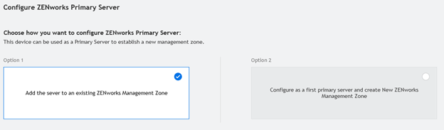 In the Configure ZENworks Primary Server screen, select the Add this server to an existing Management Zone option, and then click Next.
