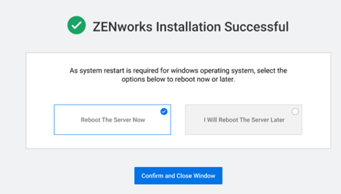 After the installation is completed, you will be asked to restart the system. You can either reboot the server, or you can reboot the server later.