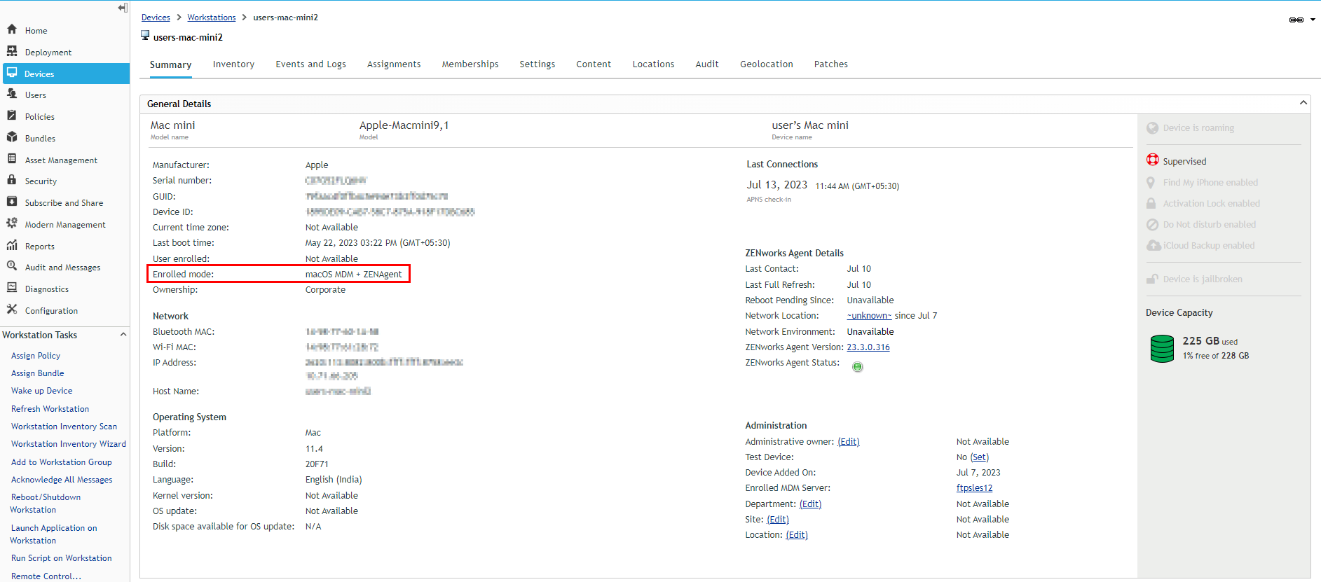 After a device is enrolled to the ZENworks Management Zone, you can view the details of your enrolled Mac MDM device in ZCC. To view this page: