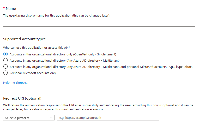6. Select Accounts in this organizational directory only. Leave Redirect URI blank, which can be updated later.