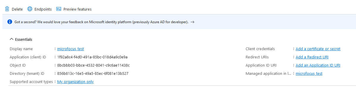 After successful validation, the following application details will be retrieved from the Azure portal and displayed in the page: