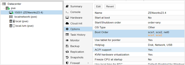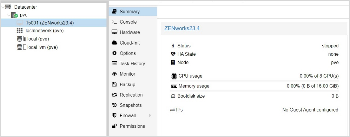 For example, qm importovf 15001 ZENworks23.4.0_Appliance-x86_64-ZENworks2020_23.4.0-dev-23.4_GMC-E.ovf local --format qcow2