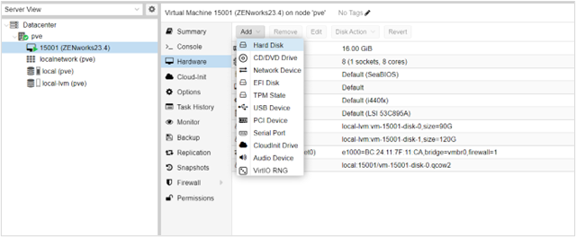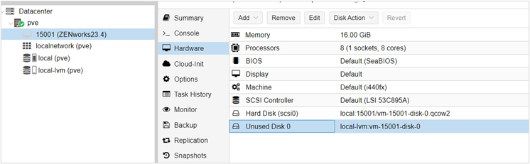 Click Hardware. This displays the list of hardware. The disk that you created using the .vmdk file is also displayed in the hardware list as Unused Disk 0 along with the storage name appended in the description. This Unused Disk 0 is the first hard disk of the appliance, which is created under the local-lvm storage.