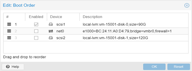 In the Edit: Boot Order dialog box, drag the first hard disk (the first disk is always 90 GB in size) to the top and then select the Enabled check box for the first disk. Click Ok to save the boot order configuration.