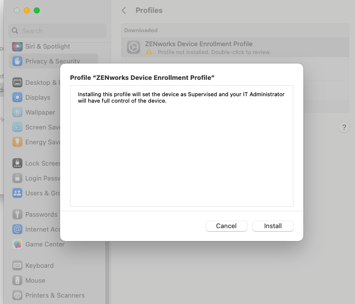 Click Install… and follow the prompts to install the profile. Once the profile is successfully installed, the device will be supervised and managed by ZENworks.