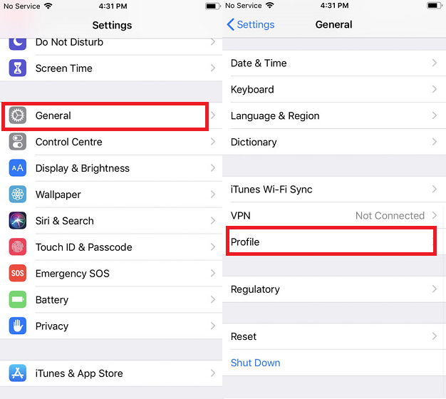 Navigate to the Settings menu on the device, click General > Profiles.