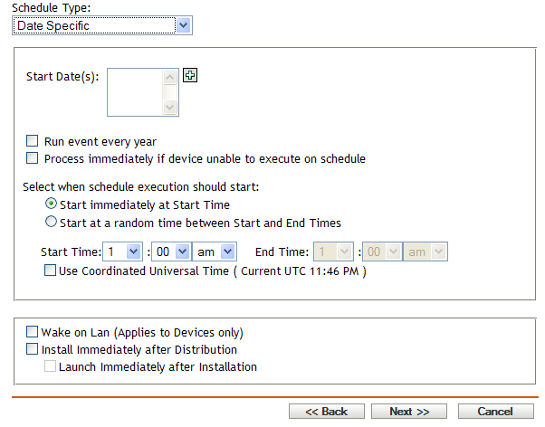 Start at a Random Time between Start Time and End Time: Starts the event at a randomly selected time between the time you specify in the Start Time and End Time fields. You can use this option to avoid possible network overload from concurrently scheduled events.