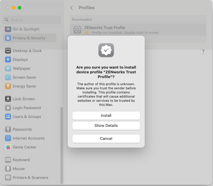 11. Click Install… and follow the prompts to install the profile. Once the profile is successfully installed, the device will be supervised and managed by ZENworks.