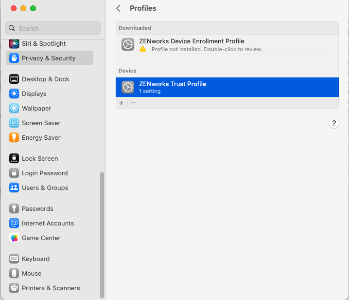 9. Navigate to System Settings > Privacy & Security > Profiles.
