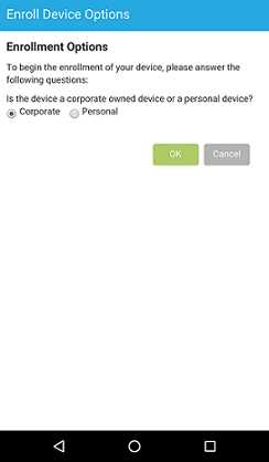 4. If you have configured the Mobile Enrollment policy to allow the user to specify the device ownership (corporate or personal), the user is prompted for that information. Tap OK.